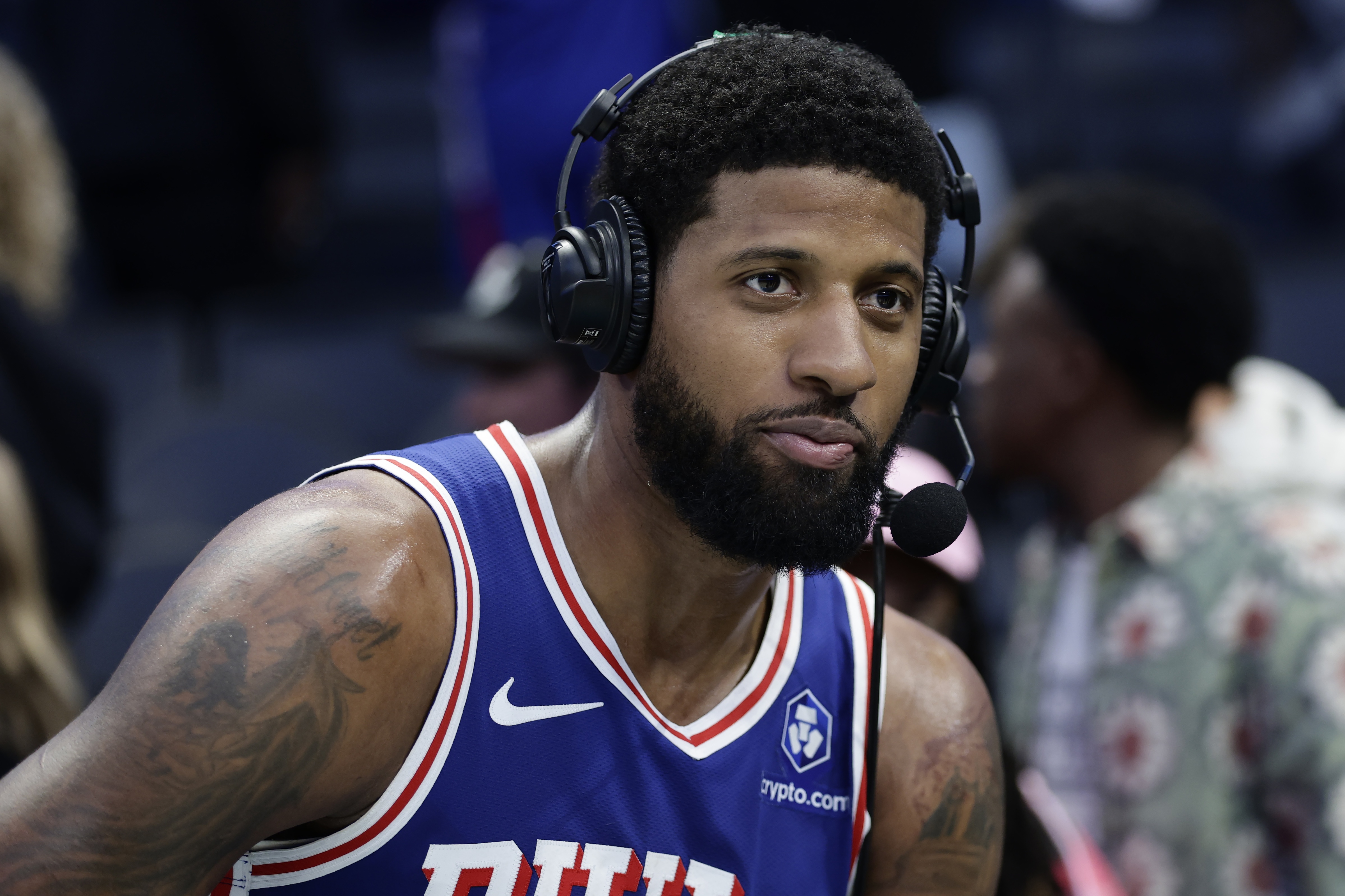 3月29日讯 76人队118-114力克黄蜂队,赛后,76人队球星乔治接受媒体采访。